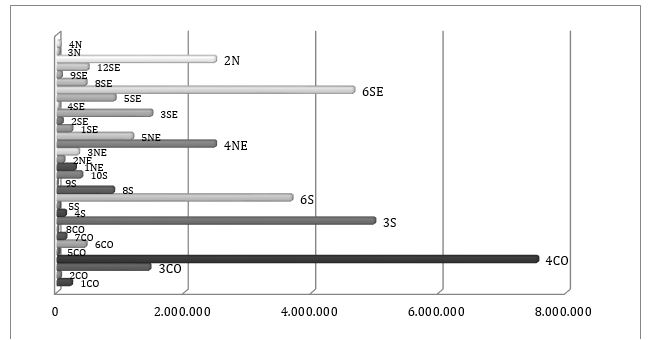 Research data, 2013Through a percentile analysis (see Chart 2), we can view the amount of handling in each region, outlining a chart that reflects the degree to which each region is responsible for the overall handling of grain in the country. Looking at the chart, the two regions that are seen to have contributed the most to the handling of crops in the previous year were the South and Midwest, together composing more than 50% of the amount handled nationally. The Southeast also shows an influence, representing 24% of all cases in the study period. Next, we observe the North and Northeast regions, comprising the remaining 20%.
