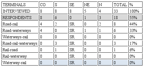 Research data, 2013Table 1 shows the characteristics of each terminal and their transaction possibilities between logistical modes such as road, rail, and waterway. Of all the terminals interviewed, only 55% responded regarding modes. Of this, 44% presented road transport to rail transpositions, 33% conducted road-waterways movements, and only 17% reported performing transactions between all three types of modes described, all of these being located in the South.