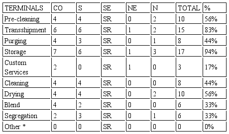 We can see that the terminals that have a greater number of activities aimed at processing crops are those found in the Midwest and South. The Northeast had the lowest rates of available services. Again, the Southeast provided no responses.
