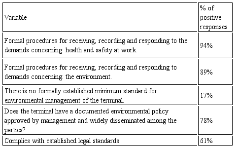 Research data, 2013Through Table 3, we can examine the percentage of responding terminals that adopt sustainable practices, whether this is compliant with established legal standards, or even if they have documented policies. It can be observed regarding the question of “health and safety” that the majority of respondents have formal procedures related to both health and safety at work (94%) as well as to the environment (89%). Moreover, only 17% have not adopted a minimum standard for environmental management of the terminal. Regarding the acceptance and dissemination of environmental activities between the parties, the index is still lower, with 78% of respondents reportedly having a policy with such characteristics. Despite this, we observed that only 61% of respondents claim to comply with legally established environmental standards.