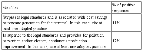 Continuing the data analysis, we can see that 17% of respondents say they have practices that surpass those that are required, but that such actions are more strongly connected to pollution prevention and cleaner improvements. Thus, we see that only a few terminals can surpass expectations concerning their actions related to the environment, and only a small portion of these can connect sustainable practices to financial and revenue gains.