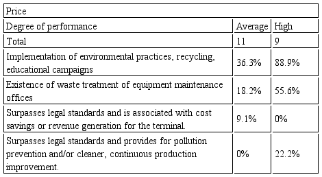 As observed, terminals that have a high degree of performance based on price are more frequent in the execution of environmental practices, waste treatments and population prevention, however, they do not excel in the execution of practices that go beyond what is stipulated when It is simply cost reduction or revenue generation.