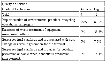 When analyzing the performance variable of “quality of service” (Table 6), this perception is repeated, since only 25% of respondents with an average performance level claim implementing sustainable practices, showing no positive responses to any other variable related to the environment. The terminals that have a high degree of performance participate in all the items connected with the sustainable actions, amounting to almost 70% of terminals that perform environmental practices; these also involve recycling and educational campaigns as part of their processes.