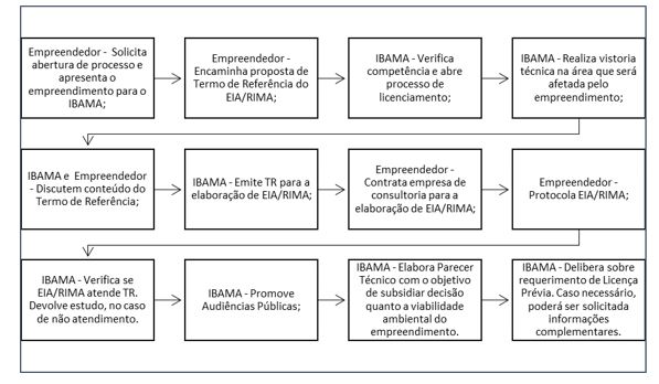 O procedimento de licenciamento prévio no IBAMA foi detalhado na Instrução Normativa [IN] do IBAMA n. 184 de 17 de julho de 2008 e segue as etapas e o fluxo demonstrado na Figura 1: