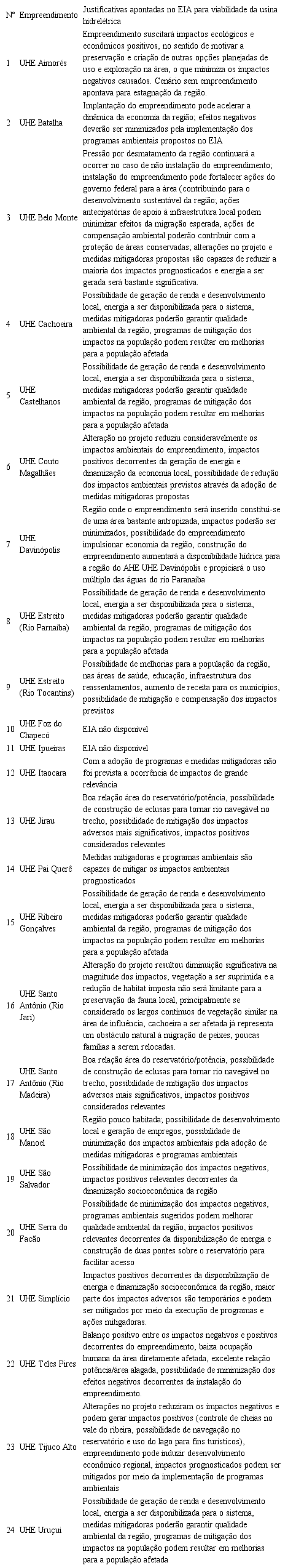 Nos estudos avaliados, destacou-se como argumentos para justificar a viabilidade ambiental: a possibilidade de minimização dos impactos negativos prognosticados por meio da adoção de programas ambientais e medidas mitigadoras, seguida da possibilidade de geração de renda e dinamização da economia da região.