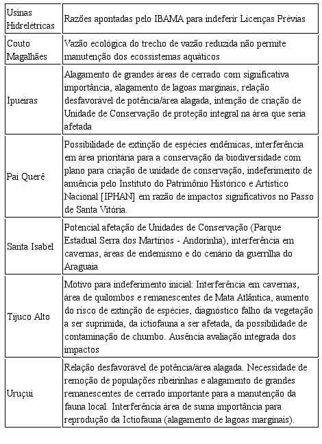 Entre as razões para o indeferimento do pedido de licença prévia, destacaram-se a possibilidade de interferência direta em unidades de conservação de proteção integral ou área com intenção de criação e a possibilidade de aumentar o risco de extinção de espécies endêmicas ou ameaçadas. Verificou-se que a alta magnitude e a irreversibilidade dos impactos ambientais decorrentes da instalação e operação de usinas hidrelétricas, conforme abordado por WCD (2000) e Lees, Peres, Fearnside, & Zuanon, (2016) são aspectos que vêm sendo considerados pelo IBAMA para definição da viabilidade ambiental. A interferência direta em terras indígenas e a necessidade de apresentação de informações complementares são aspectos preponderantes para a suspensão da tramitação dos processos.