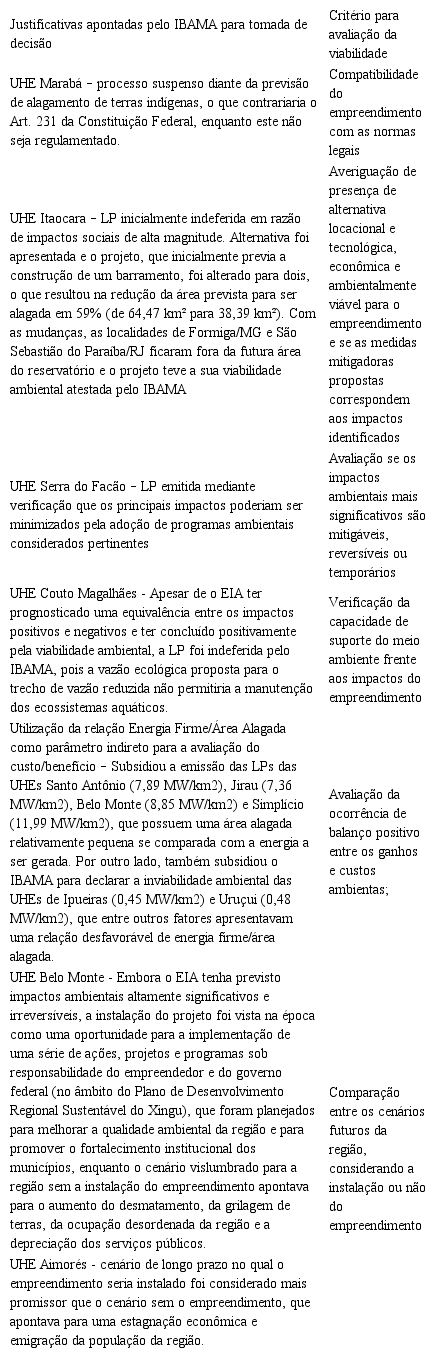 No levantamento dos processos de licenciamento ambiental federal de usinas hidrelétricas que passaram pela fase de licenciamento prévio, verificou-se que nem sempre os critérios são explicitados, tanto nos EIA's quanto nos pareceres emitidos pelo IBAMA, para definição da viabilidade ambiental.