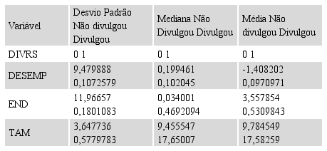 De acordo com a tabela 7, observa-se que, o desvio padrão e a mediana, assim como nas empresas de energia elétrica, configuraram-se, respectivamente, maior e menor para as empresas que não prestam o relatório de sustentabilidade. Além disso, aponta-se variações de desvios padrões elevados entre as empresas que divulgam e não divulgam o relatório nas variáveis desempenho e endividamento.