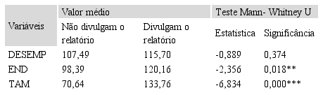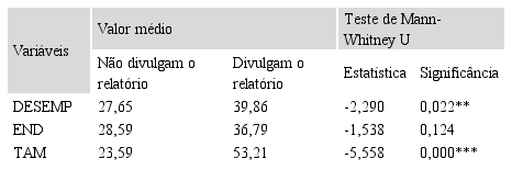 Como forma de verificar estatisticamente o comportamento dessas variáveis (DESEMP, END e TAM), quando da divulgação ou não do relatório de sustentabilidade, foi também utilizado o teste de Mann-Whitney U para as empresas do setor de telecomunicações.