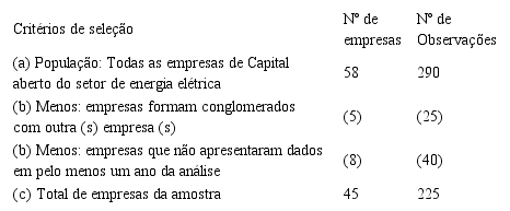 A população inicial referente às empresas do setor de energia elétrica foi composta por 58 empresas, o que nos 5 anos analisados totaliza 290 observações. Das 58 empresas, cinco organizações (AES Tietê, CEEE-GT, CPFL Energia, Energisa e Ligth S.A.) formam conglomerados com outra (s) empresa (s), sendo analisados, nestas, os relatórios de sustentabilidade e os demais dados de forma consolidada. Além disso, foram desconsideradas oito outras empresas que não apresentaram dados em pelo menos um ano da análise. Assim, a amostra validada foi composta por 45 companhias do setor de energia elétrica por ano, o que totaliza 225 observações nos 5 anos verificados. O resumo da população e amostra do Setor de Energia elétrica pode ser vista a seguir.