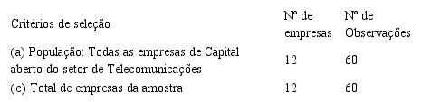 Já a População do setor de telecomunicações abrangeu 12 empresas em cada ano analisado, sendo a amostra composta pela mesma quantidade de empresas, conforme exposto a seguir: