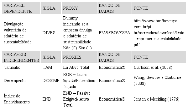 Os dados sobre as empresas que divulgam ou não o relatório de sustentabilidade foram coletados inicialmente no site da BM&FBOVESPA e outras informações, referentes às variáveis tamanho, desempenho e endividamento, foram apuradas por meio do banco de dados Economática®. Escolheu-se, para período de análise, os anos de 2010 a 2014. A seleção do início do período de análise (2010) foi motivada por este ter sido um marco da normatização internacional da sustentabilidade, por meio da ISO 26000 – Diretrizes sobre Responsabilidade Social, que estabelece práticas socioambientais voluntárias para todos os tipos de empresas, independentemente do seu porte.