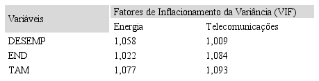 Não há indícios de correlação entre as variáveis haja visto o baixo valor dos erros padrão das variáveis. Foi realizado o teste de colinearidade por Fatores de Inflacionamento da Variância [VIF]. Assim, sendo o valor mínimo possível = 1,0 e sabendo-se que VIF 10 atesta indícios de colinearidade, infere-se que as variáveis independentes não possuem relações lineares exatas ou aproximadamente exatas. Verifica-se o resultado do teste na tabela 3.