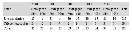Nesta seção serão analisados dados de algumas empresas listadas na BM&FBOVESPA durante cinco anos (2010 a 2014), sendo em cada ano 45 empresas do setor de energia elétrica e 12 empresas do setor de telecomunicações, o que resultou no total de 285 observações. O resumo da amostra que compõe esta pesquisa, bem como a informação de divulgação (ou não) do relatório de sustentabilidade por parte das empresas que compõem a amostra apresenta-se na Tabela 4: