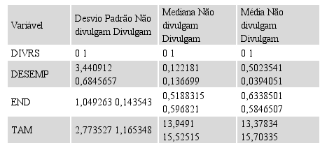 Por conseguinte, observa-se que as variáveis TAM e DESEMP apresentaram médias maiores nas organizações que divulgaram o relatório de sustentabilidade, e que somente a variável END apresentou uma média maior para as empresas que não divulgam o relatório de sustentabilidade; este último aspecto está em descompasso com o estabelecido por alguns autores ligados à Teoria da Divulgação Voluntária, como Jensen e Meckling (1976) e Clarkson et al. (2008), uma vez que estes defendem que empresas com maiores índices de endividamento são as que mais divulgam informações de forma voluntária.