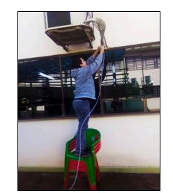 Antes da implantação do sistema foi realizada a canalização da saída de um dos climatizadores utilizando-se uma mangueira de nível (Figura 1), diretamente para uma garrafa PET, como forma de quantificar o volume de água gerado dentro de um determinado período.
