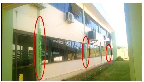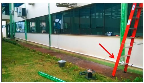 O direcionamento para a canalização pluvial existente foi realizado através da instalação de tubulação horizontal de PVC branco (esgoto) diâmetro de 50 mm, recebendo conexões tipo “Tê” posicionadas a cada interseção para receber as tubulações de queda. O projeto piloto foi instalado em uma das faces do prédio administrativo da instituição mencionada anteriormente, como apresenta a Figura 4.