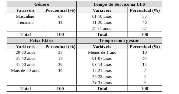 Esta pesquisa foi realizada entre os meses de janeiro e julho de 2010. Nesse período, o campus de São Cristóvão já mantinha vários cursos de graduação e pós-graduação, com mais de 7.000 estudantes, além da instituição contar, com mais de 1.049 docentes e 1.158 servidores técnico-administrativos em atividade (Barbosa, 2008). Os sujeitos selecionados foram gestores à frente da administração de setores importantes para o funcionamento da universidade e exercendo algum cargo de direção ou função gratificada. Logo, a amostra proposta inicialmente foi de 38 gestores. Contudo, houve uma recusa e sete questionários não foram devolvidos, perfazendo o total de 30 entrevistados.