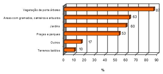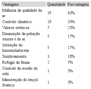 Em seguida, os gestores foram questionados sobre as vantagens proporcionadas pelas áreas verdes, levando em consideração os aspectos socioambientais. Os entrevistados citaram mais de um benefício. A maioria dos respondentes (63%) apontou pela melhoria da qualidade do ar, seguido pelo controle climático, com a redução do calor e a melhoria na ventilação do local (33%) e a redução da poluição (17%) (Tabela 2). Situação semelhante quanto às vantagens e benefícios ambientais oferecidos pelas áreas verdes e pela arborização foi obtida em outros trabalhos, como Malavasi e Malavasi (2001), Roppa, Falkenberg, Stangerlin e Brun (2007), Brun, Longhi e Brun (2009), Teixeira, Santos e Balest (2009).