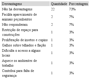 Quando indagados acerca das desvantagens proporcionadas pelas áreas verdes, setenta e três por cento (73%) dos entrevistados não perceberam nenhuma (Tabela 3), como podemos constatar na afirmação seguinte: “Não vejo desvantagens, são áreas extremamente necessárias ao bem estar do ser humano, além de contribuir para o bem estar do planeta”. Outros, contudo, apontaram desvantagens, tais como proliferação de insetos e cupins (3%), galhos que caem sobre telhados e fiações (3%), esconderijos para delinquentes (3%) (Tabela 3). Esses malefícios estão relacionados à falta de manutenção desses espaços.