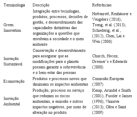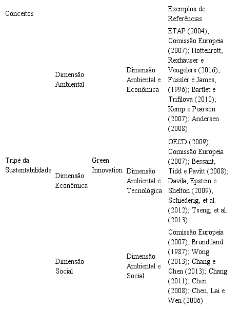 A partir de autores como Hottenrott, Rexhäuser e Veugelers (2016), Tseng, Tan e Siriban-Manalang, (2013), Schiederig, Tietze e Herstatt (2012) e Chen et al. (2006) é possível observar que algumas terminologias são utilizadas de forma similar, muitas vezes como sinônimos, ao tratar da GI. De acordo com estes autores, três delas aparecem com mais destaque nas literaturas, quais sejam: Ecoinovação, Inovação Ambiental e Inovação Sustentável. Nesta direção, este artigo procura contribuir para o esclarecimento do termo Green Innovation, tomando como base o conceito Triple Bottom Line (ou tripé da sustentabilidade) proposto por John Elkington (1997).