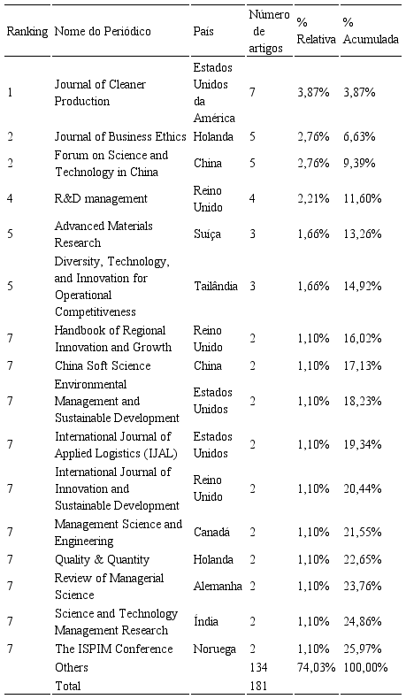 A Tabela 1 apresenta os periódicos com dois ou mais artigos sobre GI, o seu país de origem e a quantidade de pesquisas publicadas: