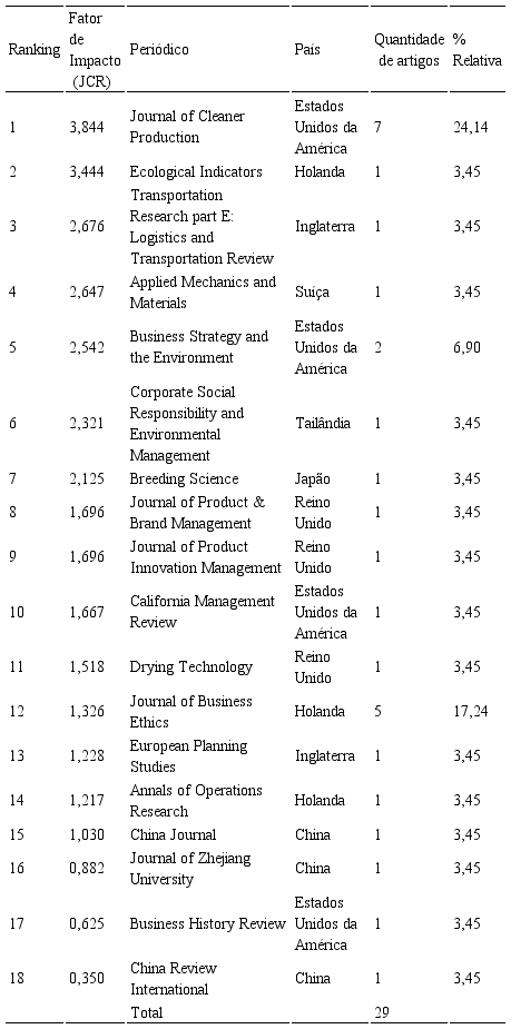 A comparação entre os dados da Tabela 1 e 2 permite avaliar a intersecção entre os periódicos com maiores números de artigos publicados com aqueles que possuem fator de impacto. Entre esses, destacam-se o Journal of Cleaner Production, o Business Strategy and the Environment e o Journal of Business Ethics, que estão presentes em ambas as tabelas. O primeiro, inclusive, aparece no topo das duas análises.