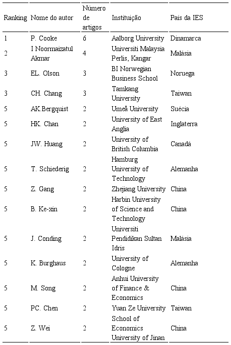 P. Cooke, da Aalborg University (Dinamarca), aparece no topo da lista, com seis publicações, seguido por I. Noormaizatul Akmar, da Universiti Malaysia Perlis (Malásia), com quatro artigos. Destaca-se o fato de haver três autores da Escandinávia (Dinamarca, Noruega e Suécia) entre os autores que mais publicam sobre o tema e o fato de haver oito autores – entre os 15 que mais publicam sobre GI – atuando em Instituições de Ensino Superior Asiáticas, localizadas na Malásia (dois autores), Taiwan (um autor) e China (quatro autores).