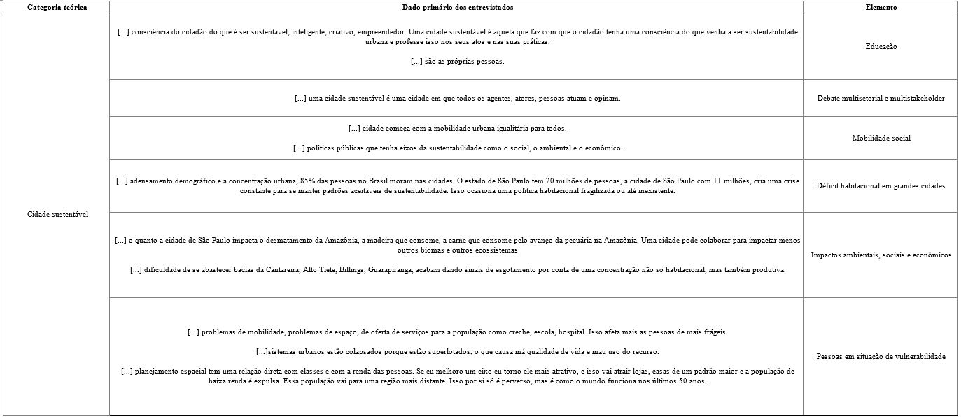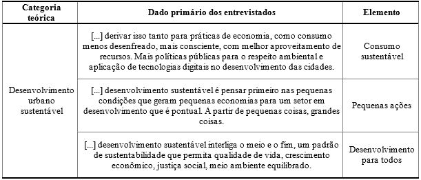De acordo com os entrevistados, o desenvolvimento urbano sustentável deve relacionar os sistemas que compõe uma cidade, ampliando as fontes de conhecimento de maneira articulada para o planejamento e execução de uma estratégia (Childers et al., 2014). Ainda, os dados esclarecem que uma cidade sustentável é uma cidade que consegue planejar a sua operação