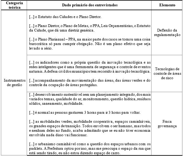 As entrevistas ressaltam ainda que o desenvolvimento urbano sustentável passa pela realização de ações de diferentes escalas, as quais se materializam com a participação dos cidadãos nos processos de reciclagem até mesmo a criação de projetos e programas de maior complexidade. Segundo eles, os gestores públicos devem ter em mente que uma cidade sustentável deve envolver os cidadãos e ser boa para todas as pessoas. Assim, a seguir apresenta-se os resultados da Categoria Instrumentos de Gestão.