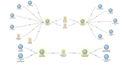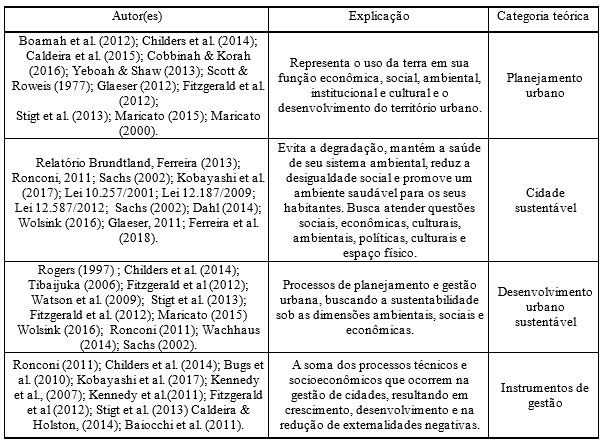 O planejamento urbano apresenta a importância do uso da terra em sua função econômica, social, ambiental, institucional e cultural e o desenvolvimento do território urbano. Já a categoria teórica da cidade sustentável busca evitar a degradação e mantém a saúde de seu sistema ambiental. Busca-se reduzir a desigualdade social por meio de um ambiente saudável para os seus habitantes. O desenvolvimento urbano sustentável apresenta a design de processos de planejamento e gestão urbana, com foco na sustentabilidade sob as dimensões ambientais, sociais e econômicas. Por último a categoria de instrumentos de gestão está relacionada aos processos técnicos e socioeconômicos que ocorrem na gestão de cidades, resultando em crescimento, desenvolvimento e na redução de externalidades negativas.