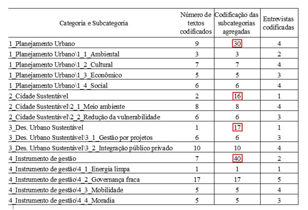 A Tabela 1, gerada pelo software Nvivo 11, apresenta o número de textos codificados, as codificações das subcategorias agregadas e o número de entrevistas codificadas para cada uma das categorias e subcategorias.