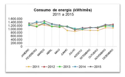 Observa-se que no ano de 2011, entre junho e outubro ocorreu uma queda significativa no consumo de energia elétrica do hospital. No mesmo período dos anos subsequentes, de 2012 a 2015, também ocorreu uma leve redução no consumo de energia. Cabe destacar que esta é justamente a época do ano em que são registradas menores temperaturas na cidade do Rio de Janeiro.