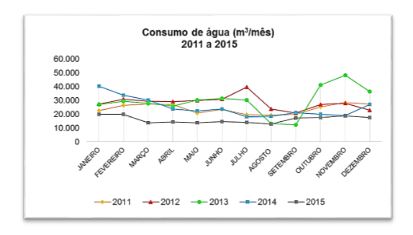 Quanto ao consumo mensal de água, verificou-se que no mês de julho de 2012, ocorreu um pico no consumo em relação ao mesmo período nos outros anos avaliados (Figura 2). Em 2013, no período de agosto a setembro houve uma queda significativa no consumo de água, seguida de um aumento relevante no consumo nos meses posteriores (outubro, novembro e dezembro). Nota-se ainda, que o ano de 2015, foi o ano de menor consumo.