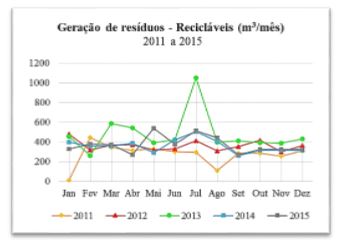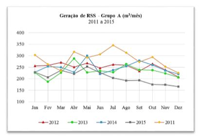 Observando-se o gráfico da Figura 4, percebe-se a ocorrência de um desvio em meados de 2011, quando houve uma maior geração em comparação ao mesmo período nos outros anos avaliados. Durante entrevista realizada para este trabalho, um dos colaboradores do hospital relatou que no ano de 2012 houve variação no processo de pesagem deste tipo de resíduos devido a problemas na gestão do hospital. Cabe destacar que no ano de 2015, a geração de resíduos deste tipo reduziu gradativamente desde junho até o final do ano.