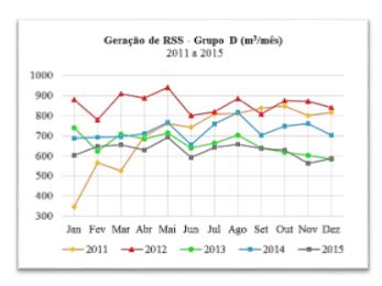 No mês de janeiro de 2011 não foi realizado o registro da pesagem dos resíduos deste grupo. Já em dezembro de 2013, foram retiradas 7.764 unidades de lâmpadas fluorescentes. Em julho de 2012, houve um pico na geração deste resíduo, em comparação aos demais anos, e abril de 2015, foi o mês com a menor geração de resíduos do grupo B. Os volumes mensais de geração de RSS do grupo D no período estudado são mostrados na Figura 6.