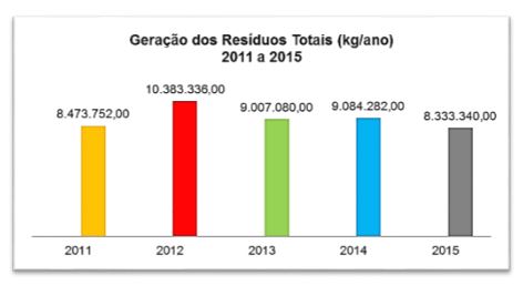 Quanto aos resíduos totais gerados observa-se no gráfico da Figura 9 que ao longo do período avaliado, o ano de 2012 foi o que apresentou a maior geração de resíduos totais e o ano de 2015 foi o que apresentou o menor volume.