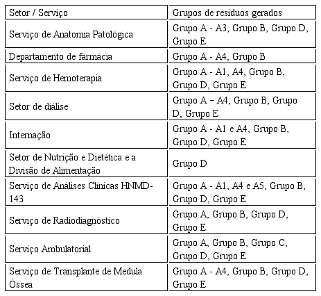 Os grupos de resíduos de serviços de saúde (RSS) gerados em alguns dos setores e serviços são apresentados na Figura 3, conforme dados apresentados no PGRSS do hospital, disponibilizado para consulta durante esta pesquisa (Marinha do Brasil, 2015).