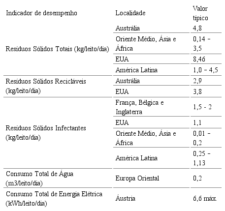 Com a finalidade de avaliar se o hospital estudado apresenta índices semelhantes aos demais estabelecimentos de saúde avaliados na bibliografia consultada, foram considerados os valores de referência para os seguintes indicadores de desempenho ambiental e comparados com os indicadores do Hospital Naval Marcílio Dias: