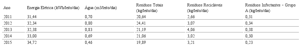 Para o hospital estudado, definiu-se como indicadores: resíduos sólidos totais (kg/leito/dia), resíduos recicláveis (kg/leito/dia), resíduos infectantes (kg/leito/dia); consumo de água (m3/leito/dia); consumo de energia elétrica (kWh/leito/dia). Na Tabela 4 são apresentados os dados obtidos no levantamento de campo e os indicadores de performance calculados para esta pesquisa visando a avaliação da performance ambiental do hospital em questão ao longo do período de 2011 a 2015.