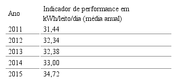 Em comparação aos indicadores propostos pelo Centro Nacional de Produção Mais Limpa e Tecnologias Ambientais, pode-se afirmar que o hospital estudado apresenta baixa performance quanto ao consumo de energia elétrica. Isto porque, segundo o CNPML (2001), o consumo máximo de energia é de 6,6 kWh/leito/dia, enquanto no hospital estudado este indicador variou entre 31,44 kWh/leito/dia e 34,72 kWh/leito/dia no período avaliado, quase seis vezes o valor de referência.