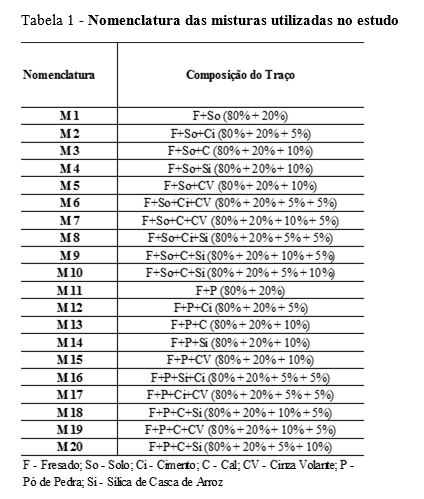Foram realizadas misturas contendo material fresado, pó de pedra, solo, aglomerantes e adições minerais. Para cada mistura as quantidades de aglomerantes e adições minerais foram calculadas com base na proporção de massa na mistura de 80% de fresado e 20 % de pó de pedra ou solo. Foram realizadas 20 diferentes misturas, identificadas na Tabela 1. A composição das misturas tendo como base 80% de material fresado e 20% de solo ou pó de pedra se deu por análise previa das curvas granulometricas dos materiais, e pelo fato de que as adições de 20% de solo ou pó de pedra ao material fresado proporcionaram um ganho de trabalhabilidade nas misturas.