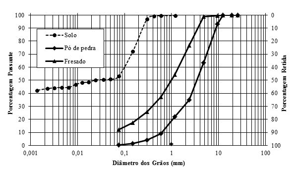 Na Figura 1 são apresentadas as curvas granulométricas do material fresado, do pó de pedra e do solo utilizados no presente estudo.