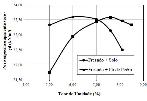 Foi determinado o teor de umidade ótima para a mistura de 80% Fresado e 20% Pó de Pedra, sendo obtido o peso específico aparente seco máximo (γdmax) igual a 23,58 kN/m³ para a umidade ótima (wótima) de 7,5%, onde esse teor foi utilizado para as demais misturas contendo pó de pedra. Já para mistura de 80% Fresado e 20% Solo, foi obtido o peso específico aparente seco máximo (γdmax) igual a 23,52 kN/m³ para a umidade ótima (wótima) de 9,0%, esse teor foi utilizado para as demais misturas contendo solo. As curvas de compactação estão apresentadas na Figura 2.