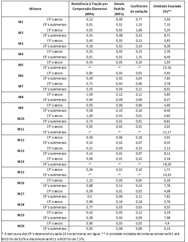 Na Tabela 2 estão apresentados os valores médios da resistência a tração por compressão diametral das misturas estudadas, bem como os valores de desvio padrão e coeficiente de variação para um conjunto de 3 amostras ensaiadas para cada mistura. Também é apresentada a umidade na qual as amostras foram rompidas.