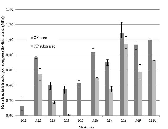 Analisando a Figura 3, para as misturas a seco, nota-se que entre as misturas de fresado e de solo, a que manifestou maior valor de Resistência à Tração por Compressão Diametral foi a mistura M8, com 5% Cimento e 5% de Sílica de Casca de Arroz. No entanto as misturas M9 (com 5% de Cal e 10% de Sílica de Casca de Arroz) e M10 (com 10% de Cal e 5% de Sílica de Casca de Arroz) também poderiam ser utilizadas como camada de pavimento.