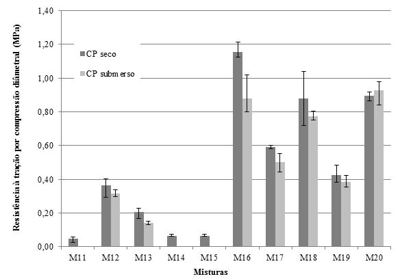 Em estudo conduzido por Pires, Specht, Pinheiro, Pereira e Conceição (2013), em amostras de material fresado com adições de cimento, foi constatado que o valor da resistência à tração por compressão diametral é equivalente a 16% do valor da resistência por compressão simples. Tomando esta relação para o presente estudo, pode-se admitir que o valor de 2,1 MPa, prescrito pelas normas NBR 12253 (ABNT, 2012) e DNIT 143 - ES (DNIT, 2010a) como resistência mínima obtida no ensaio de resistência à compressão simples para aplicação de materiais em camadas de base de pavimentos, é atendido pelo ensaio de resistência a tração por compressão diametral quando a resistência for ≥ 0,336 MPa.