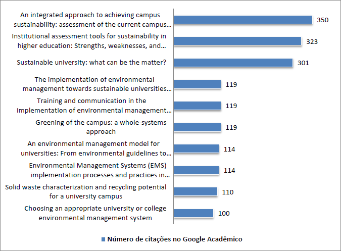 Em relação aos artigos de maior reconhecimento científico, o destaque foi atribuído ao “An integrated approach to achieving campus sustainability: assessment of the current campus environmental management practices” de Alshuwaikhat e Abubakar (2008), com 350 citações no Google Acadêmico. Contrapondo-se com a frequência de aparições nas referências do portfólio, tal artigo igualmente recebeu ênfase frente aos demais com suas 9 presenças.