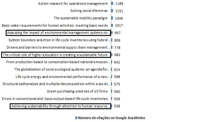 Ainda se observa uma leve supremacia do International Journal of Sustainability in Higher Education (159 citações) em relação ao Journal of Cleaner Production (133 citações) na ordem de 26 artigos, diferentemente do que ocorreu na composição do Portfólio Bibliográfico, no qual este último alcançou o primeiro lugar.