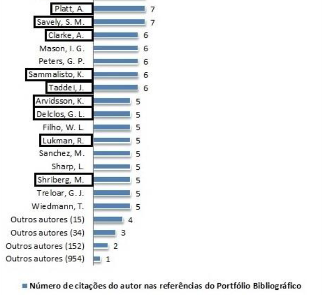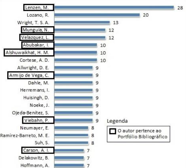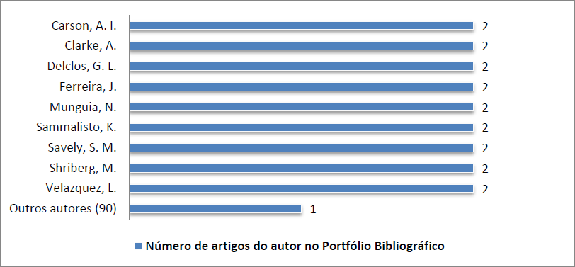 Os autores que possuem mais trabalhos no Portfólio Bibliográfico são Carson, Clarke, Delclos, Ferreira, Munguia, Sammalisto, Savely, Shriberg e Velazquez, representados duas vezes, cada um. Esse indício retrata que o tema ganhou abrangência, fazendo com que nenhum autor alcançasse destaque sozinho. Todavia, nas referências desse portfólio, Lenzen (que inclusive pertence ao portfólio) e Lozano adquiriram notoriedade com suas pesquisas, sendo citados 27 e 20 vezes, respectivamente.